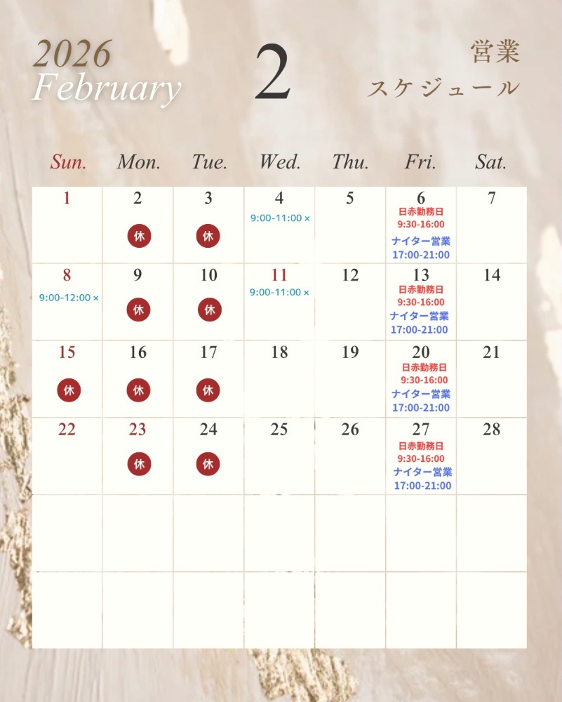 | 9:00~18:00 | 休 | 休 | ○ | ○ | / | ○ | ※ |